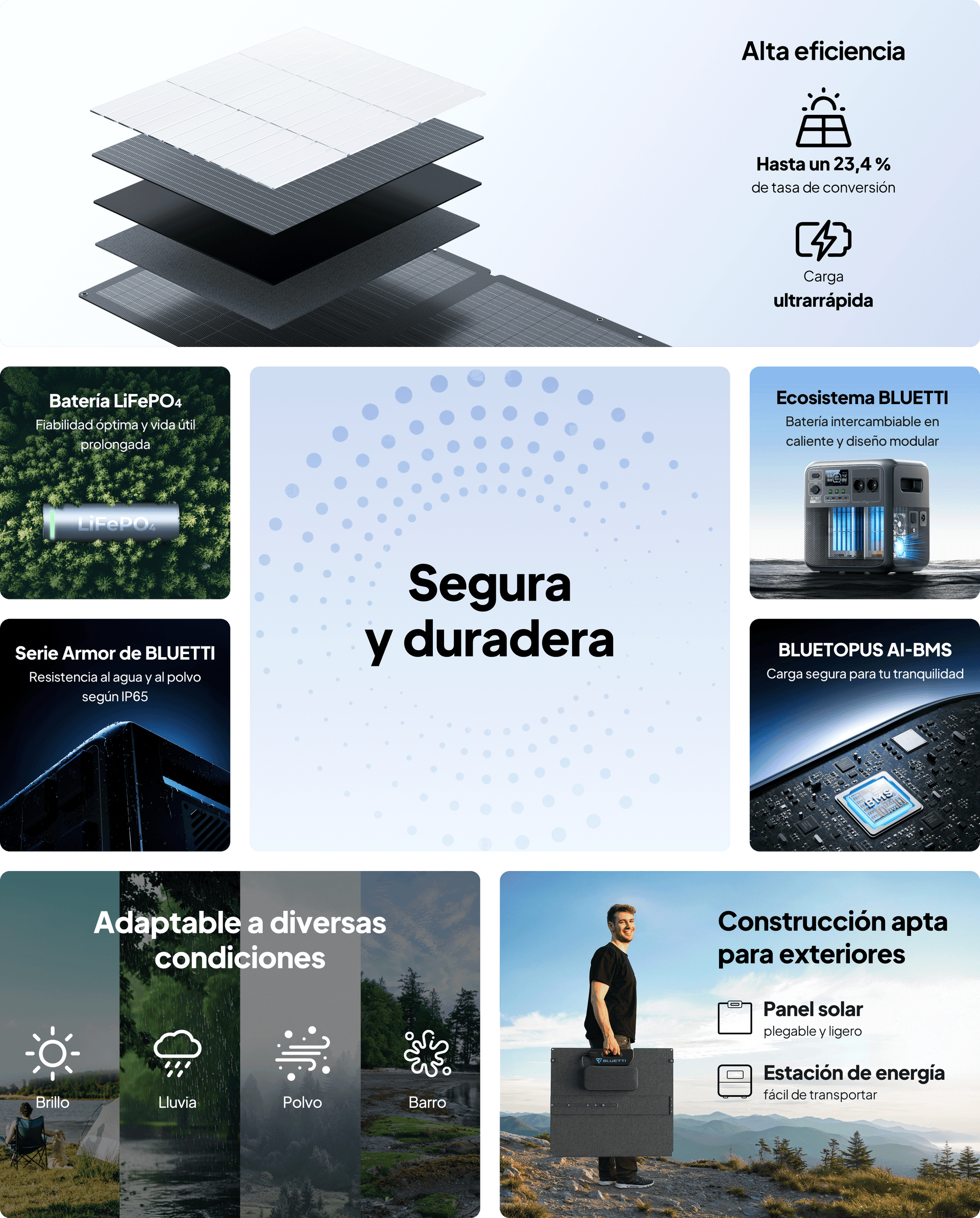 Un generador solar es un sistema que combina un panel solar y una central eléctrica portátil. Capta la luz solar, almacena la energía en una batería y alimenta tus dispositivos en cualquier lugar y momento, sin gas, ruido ni contaminación.