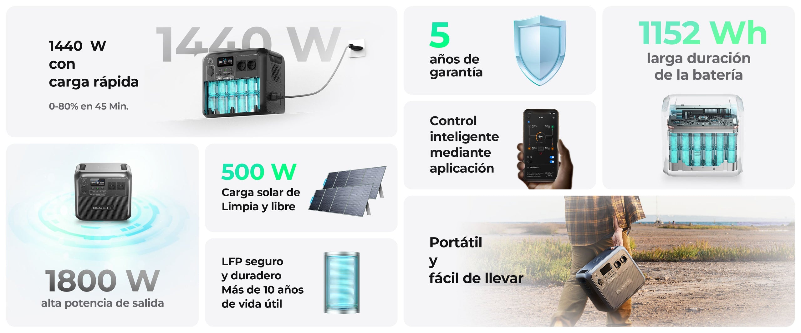 La seguridad es siempre nuestra prioridad. La AC180 está equipada con baterías LiFePO₄ más seguras, para garantizar su durabilidad y más de 3500 ciclos de vida. También se incluye una garantía de 5 años y un servicio técnico de primera clase para mayor tranquilidad.