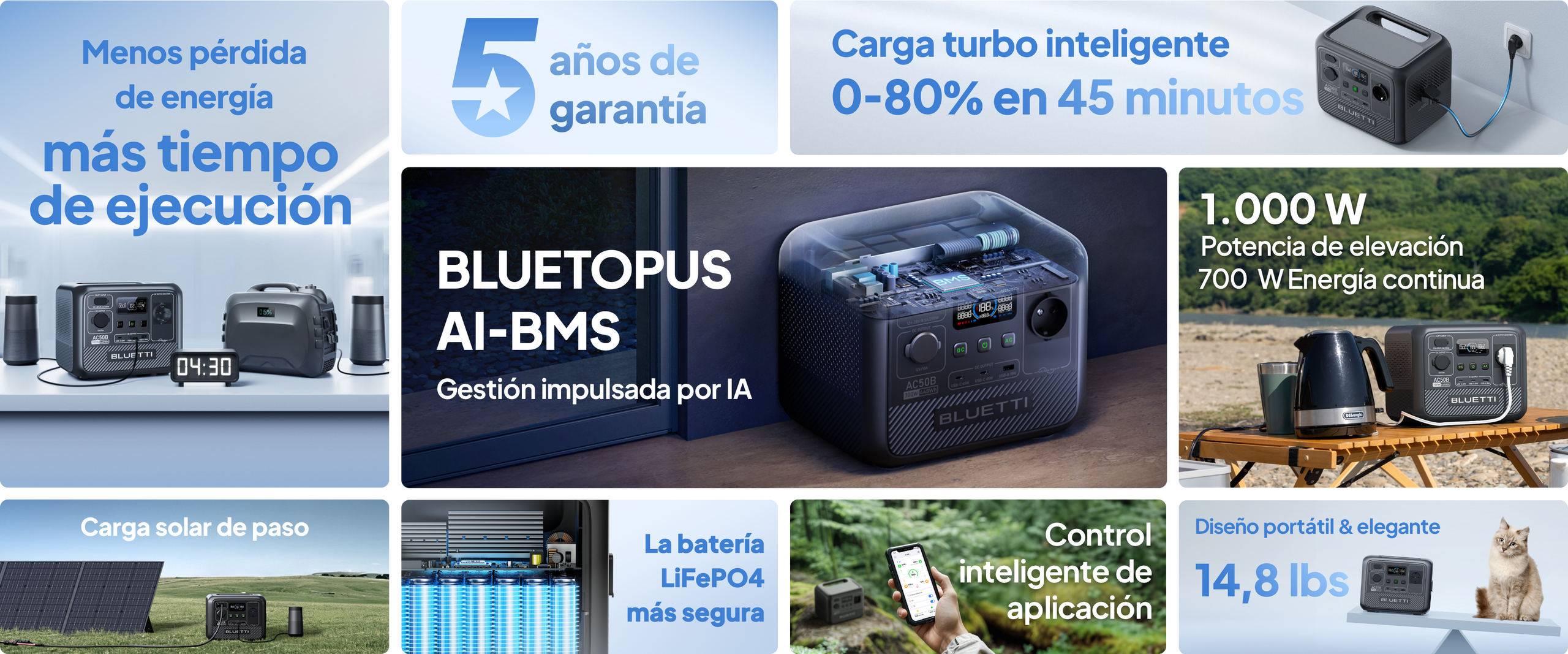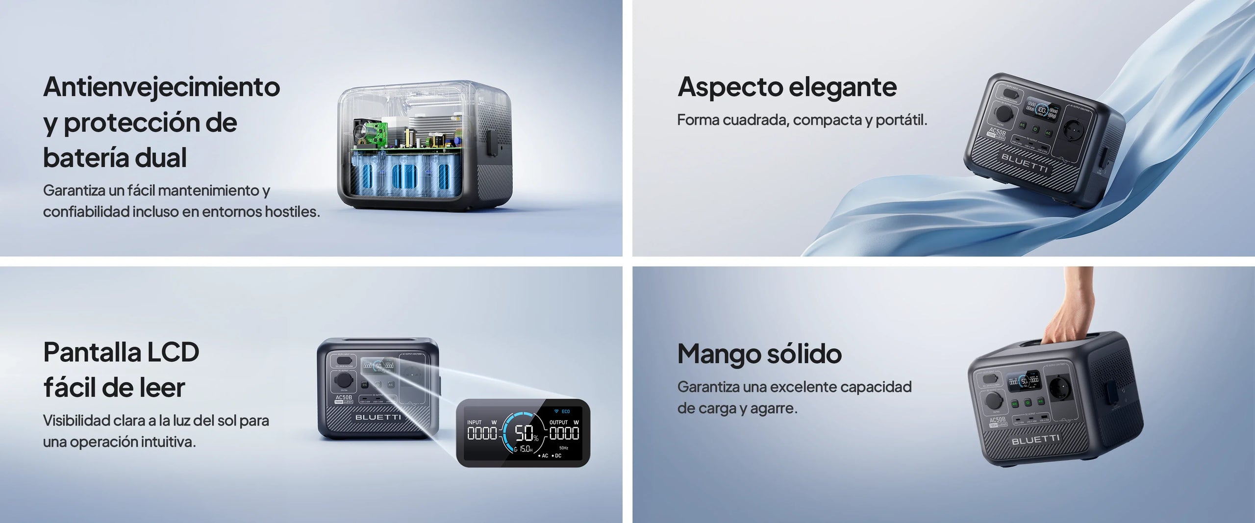 768 Wh2 × 230 V (1.000 W Total)950 W Máx.500 W Máx.LiFePO₄ 3.000+ ciclosBLUETTI App (Bluetooth)31,5 x 20,8 x 25,6 cm10,2 kg