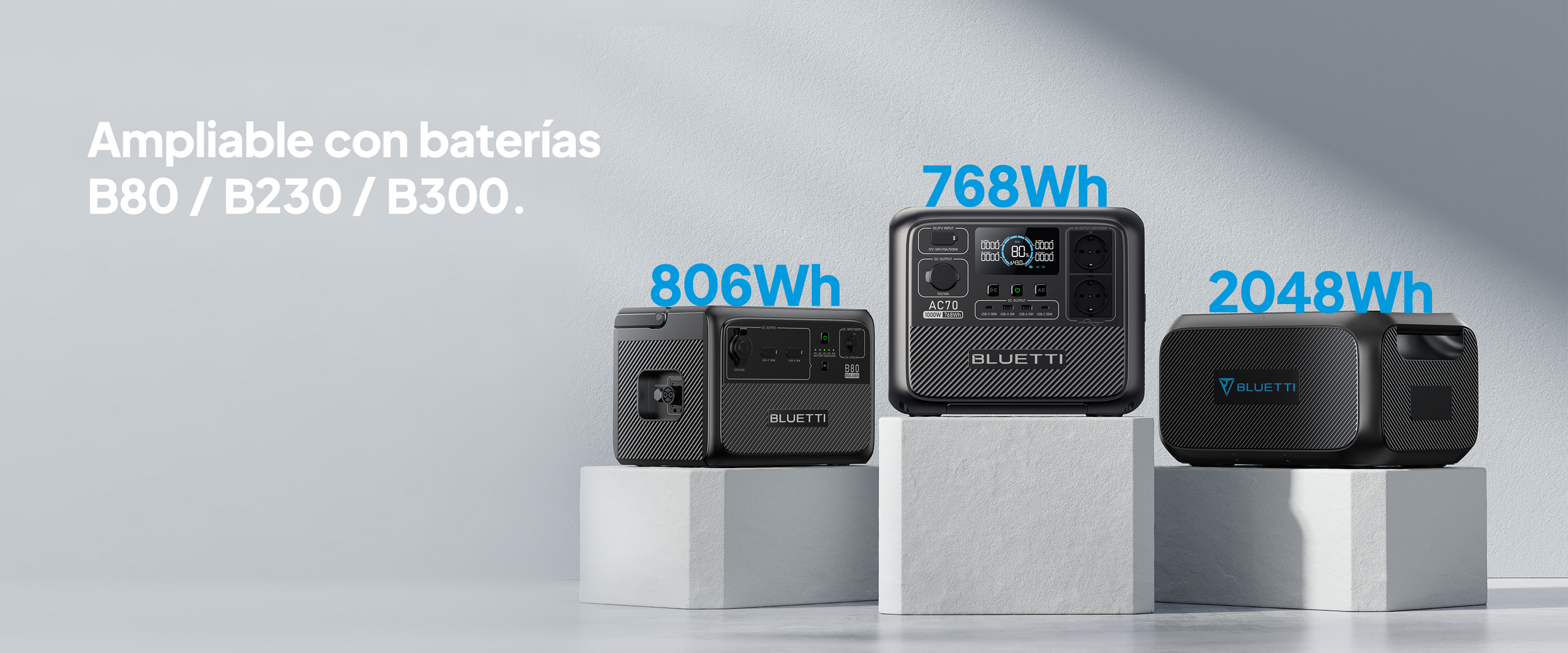 La AC70 se combina perfectamente con las baterías de expansión B80 (806 Wh), B230 (2.048 Wh) o B300 (3.072 Wh) para una fuente de alimentación continua. Deja de preocuparte por si te quedas sin energía antes de llegar a tu próximo destino.