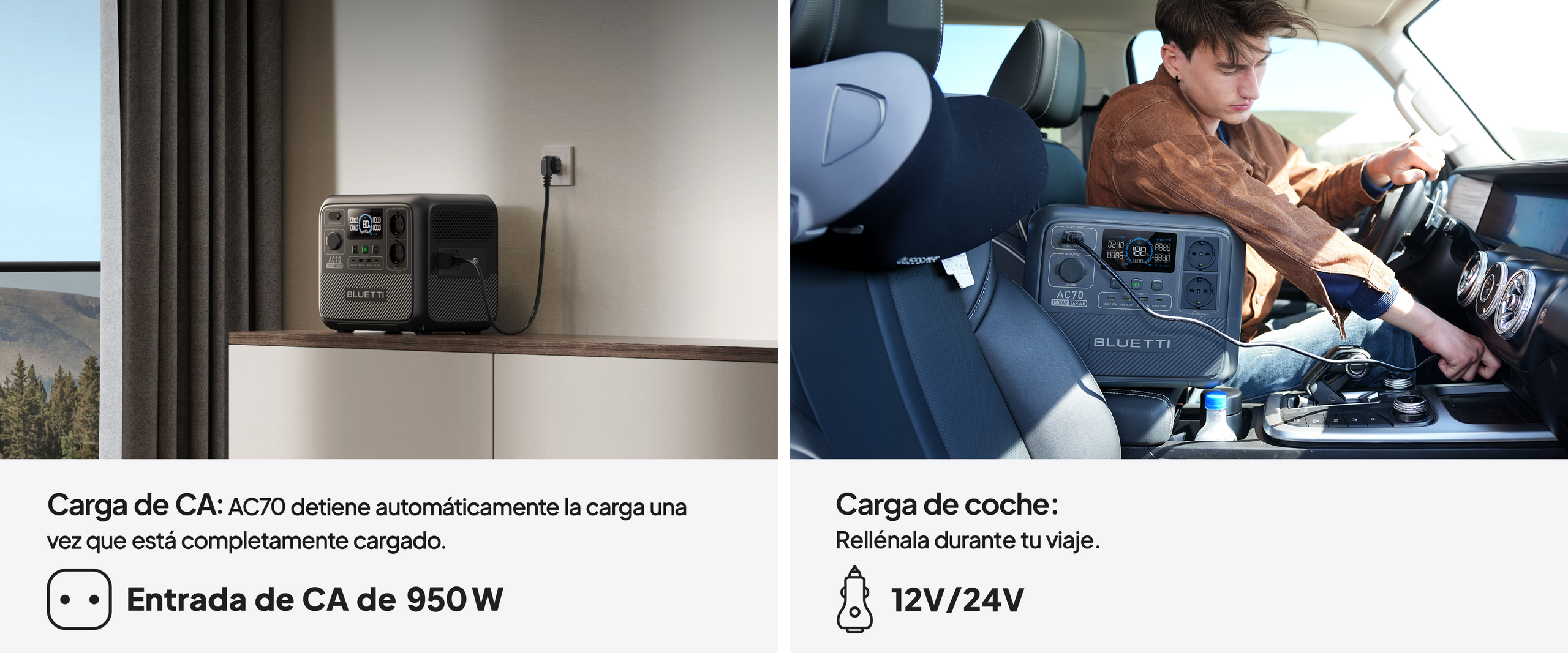 Cárgalo con hasta 950 W de carga de turbo, asegúrate de tener energía instantánea lista para viajes de última hora. El AC70 detiene automáticamente la carga para evitar la sobrecarga. Incluso puede cargarlo con el puerto del encendedor de cigarrillos del vehículo, lo que garantiza suficiente energía sobre la marcha.
