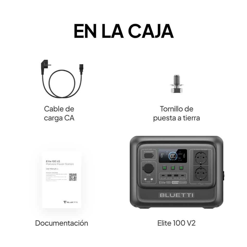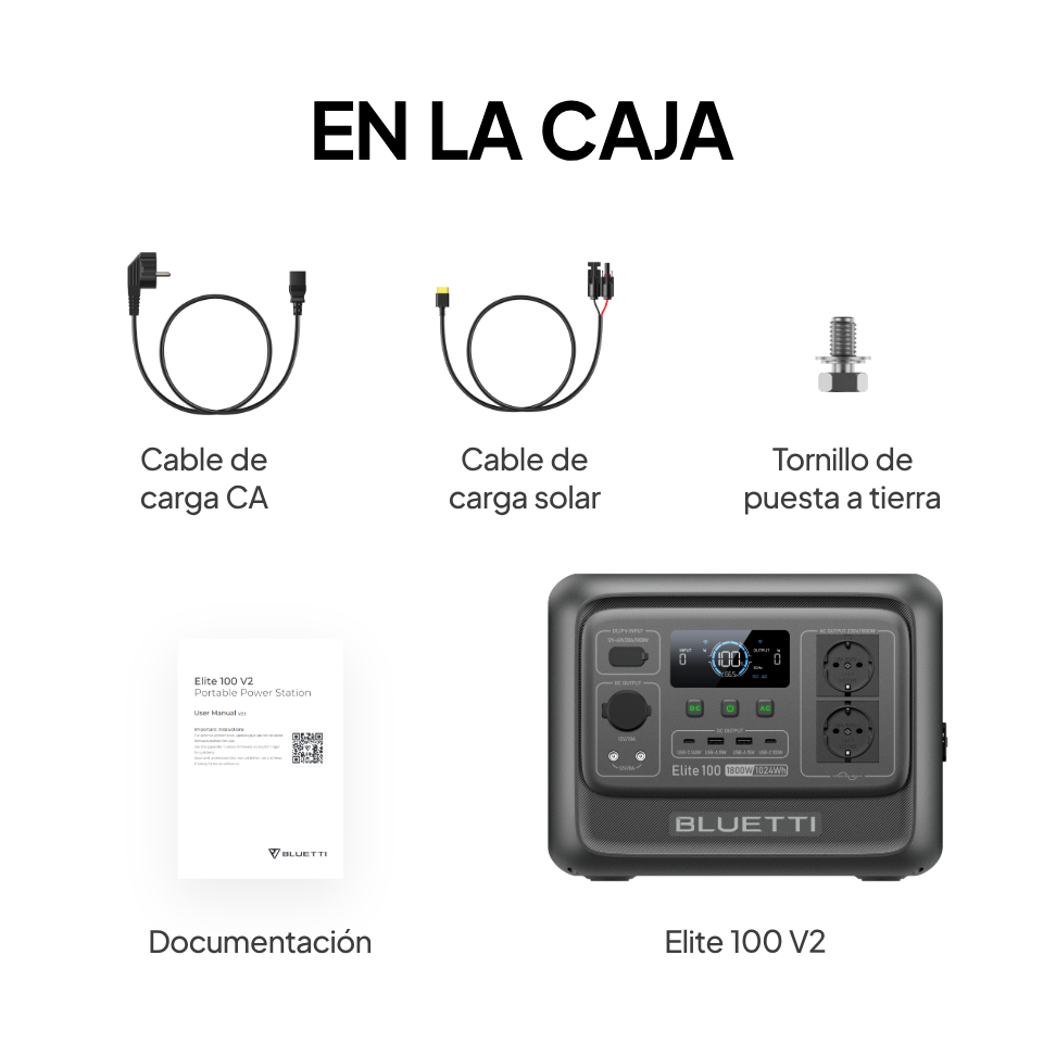 1× Estación de energía Elite 100 V2, 1× Cable de carga CA (70.87 in / 1.8 m), 1× Cable de carga solar (59.06 in / 1.5 m), 1× Tornillos M5, 1× Manual de usuario. -