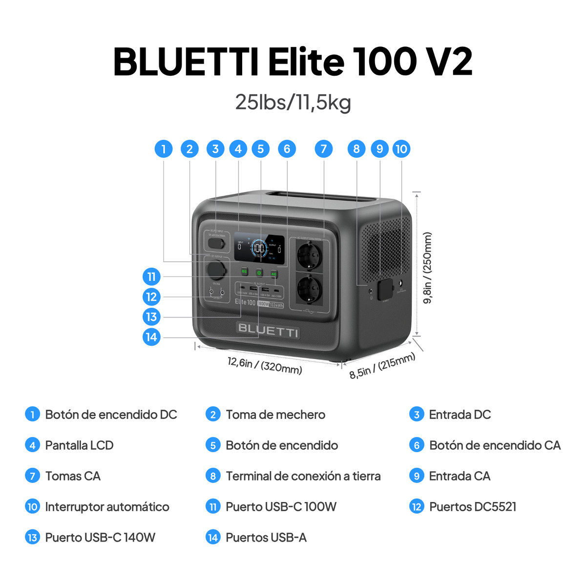 La Elite 100 V2 es la nueva estación de energía portátil ultraligera de BLUETTI, con una capacidad de 1.024 Wh y una salida de 1.800 W. Ya sea que enfrentes un corte de luz, salgas de campamento, alimentes tu caravana o respaldes equipos sensibles como máquinas CPAP, es tu solución confiable para cualquier situación. -